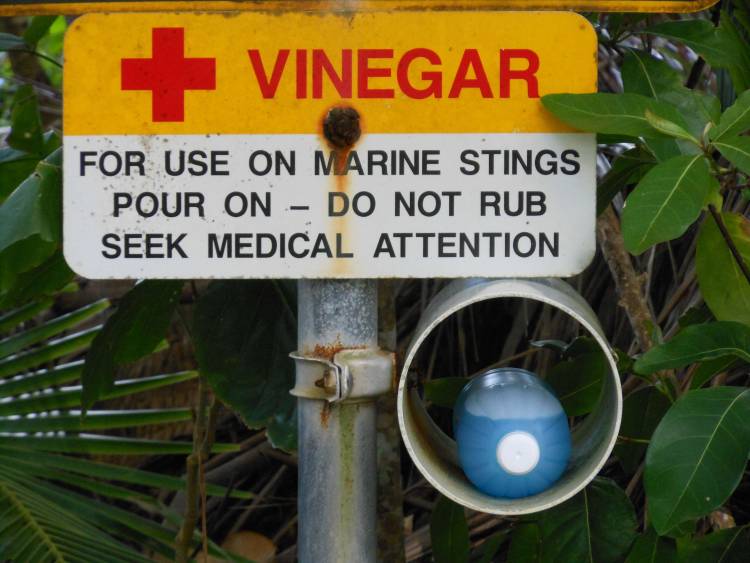 There are many old wives' tales about the correct treatment for a jellyfish sting. But, research has shown that the best treatment for a jellyfish sting, including deadly box jellies, is to leave the sting in place, wash the sting and the entire wounded area in vinegar and then soak the wound in warm 45° water for about half an hour. Tentacles can be pulled off with gloves or tweezers. Although low-tech, this treatment is nearly as effective as some of the more difficult to acquire topical ointments.
