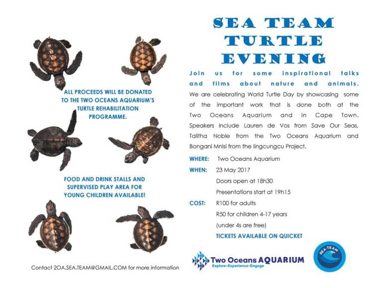 Please join us on Tuesday 23 May for an evening of fascinating talks and films about nature and animals. All proceeds for the evening will be donated to the Two Oceans Aquarium’s Turtle Rehabilitation and Release Programme.