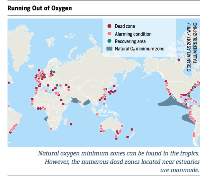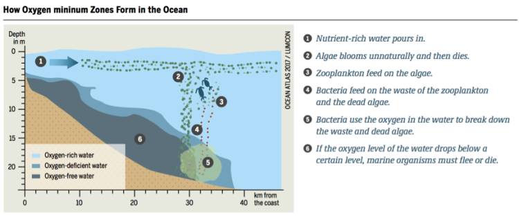 Dead zones are low-oxygen areas in the ocean and lakes around the world where very little plant and animal life exists. Dead zones are caused by human activity on land that produces excessive nutrient pollution. The effects of the over-fertilisation of seawater are called eutrophication. So, what does this mean? It means that so much artificial fertiliser is used in commercial agriculture that crops cannot absorb it all and the excess ends up in the ocean. This sets off a process whereby algae and plankton grow at tremendous rates, die off, and sink to the ocean floor where bacteria consume the matter. This process depletes the oxygen in the area, creating a zone where animals and plants cannot survive, as there is not enough oxygen. This is known as a dead zone.