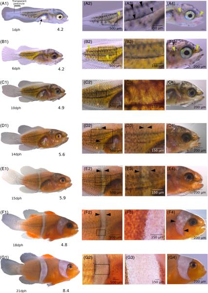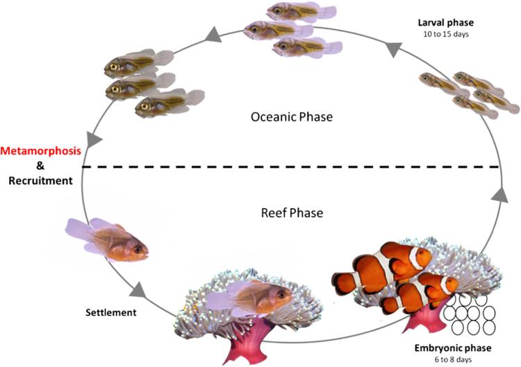 These tiny clownfish larvae will feed on microplankton until they are large enough to establish themselves near the reef - whereupon they will either try to join an existing group of clownfish, or will start a new group with other juveniles around an unoccupied anemone - the largest two becoming the new breeding pair.