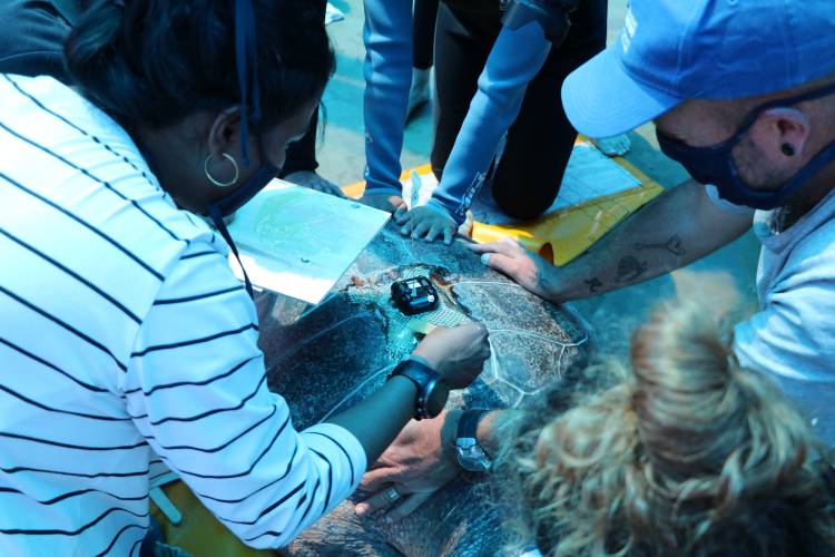 Despite recovering really well, Annie is still floating at a 45-degree angle, with her bottom up when she rests on the sand. The Aquarium Foundation staff fondly refer to this unique pose as ‘bubble butt’. While it looks a bit awkward, Annie is fully able to do all the things a healthy turtle needs to be able to do. She can swim, dive, feed, breath, chase and rest, and has therefore been cleared for release by the Aquarium Foundation vet. It is hoped that having an ocean of space and loads more depth will help sort out her bubble butt. Staff are also excited to have satellite-tagged her and to be able to track her movements, ensuring all is in order and seeing where she ventures to.