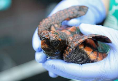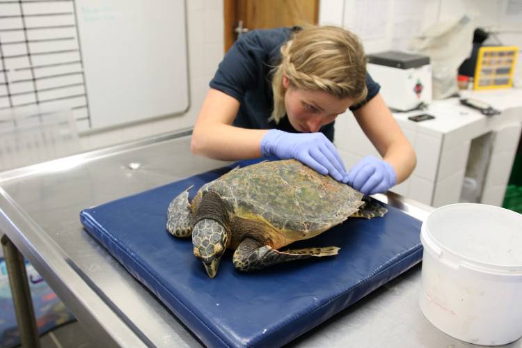 Tuesdays: The turtle hatchlings get a chance to spread their flippers and fly over to the veterinary clinic where each one gets a health checkup. Their physical exam checks their eyes, mouths, cloacas, skin and shells for any sign of abnormality or infection and gives the Aquarium a chance to update their treatments if needed. The behaviour of turtles is also assessed to see if they are feeding and swimming normally for a turtle their size.