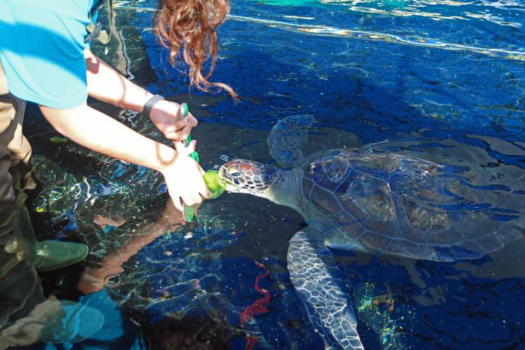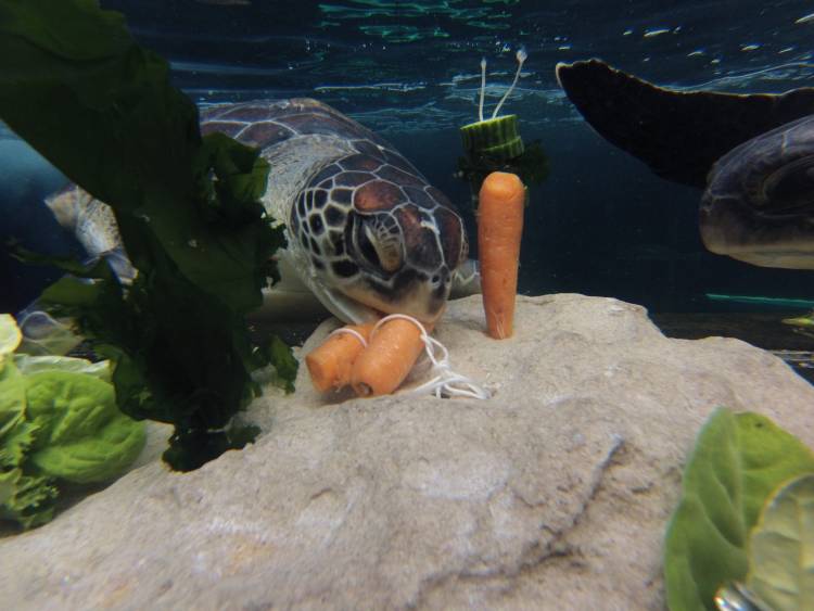 The green sea turtles in the I&J Ocean Exhibit need some practice in foraging for food so that they don't lose the skills they will need when they are released. They are led into an isolated pool where assorted seaweeds and green vegetables are thrown into the water, which they must forage on for breakfast.