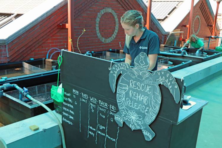 Large turtles that are not in the I&J Ocean Exhibit, but are living in our other rooftop quarantine tanks, also get fed at this time, and each is given a meal specifically formulated to meet their nutritional needs.