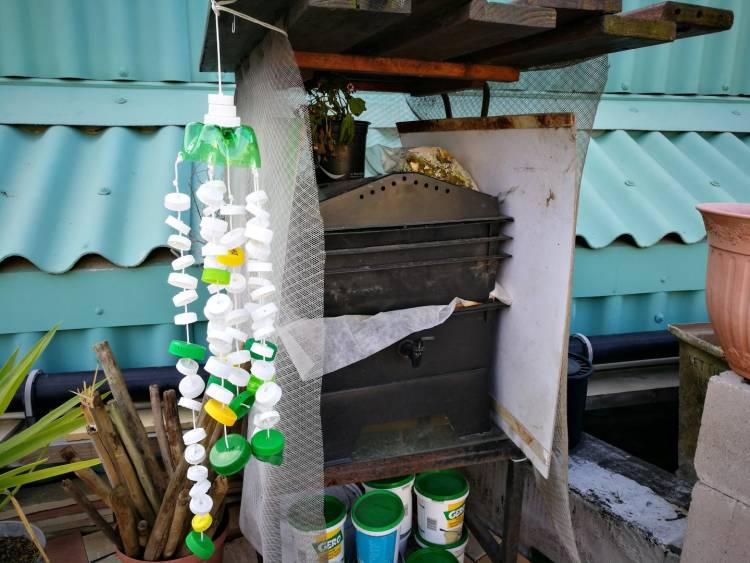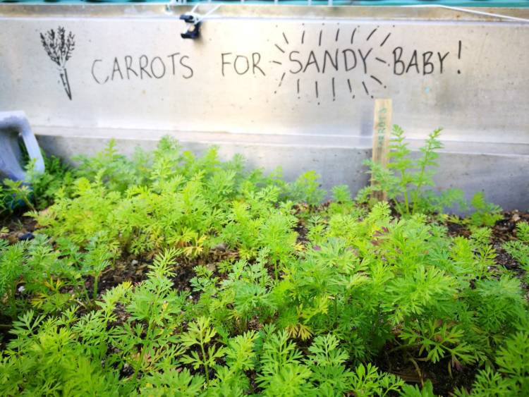 And the original sustainability goal has not been lost either. Condensation from nearby air conditioners is used to keep the veggies watered, and lunch scraps are being added to a productive little worm farm.