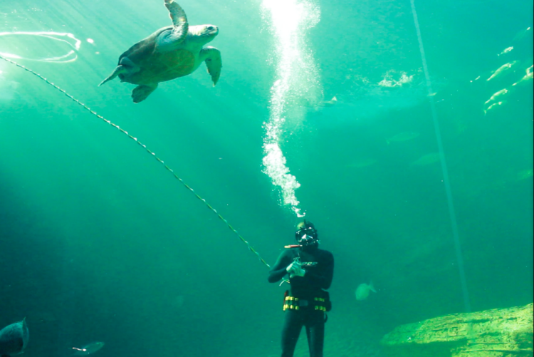 Simon Leigh, the main aquarist who dives with the communication system, had this to say about the experience: “It is maybe one of the best things I have ever done in my life! I love diving with the comms system because it combines two of my favourite things – diving and educating people about the ocean. I get to speak to people, while under water, and tell them about the amazing animals in this exhibit and how we can make a difference to ocean health. It is a tricky thing to master, but certainly worth the effort!”