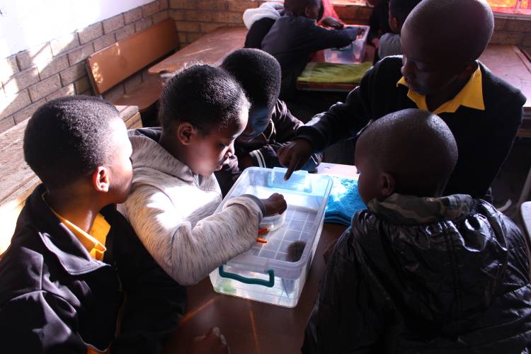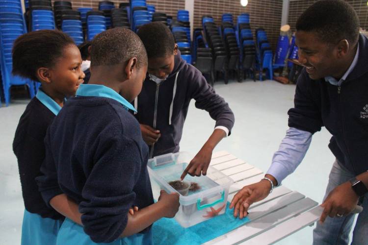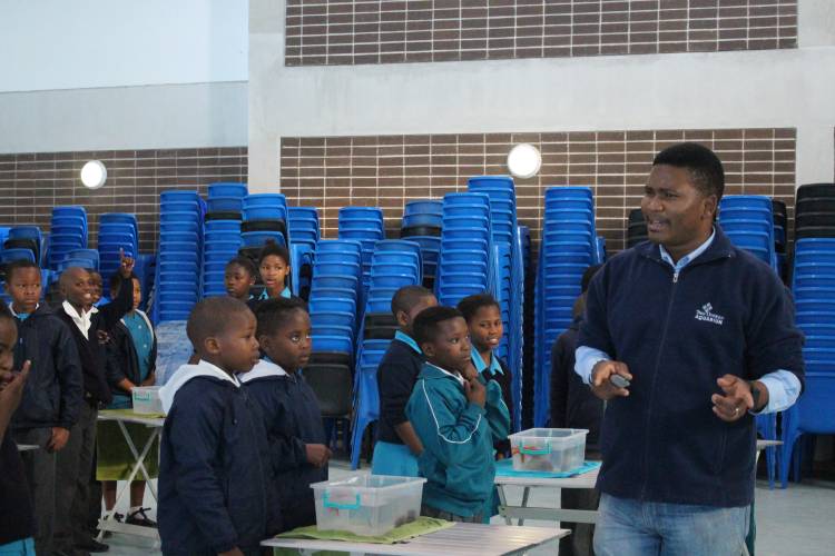 Learners were split into small groups, each being placed at a table with a mini-rockpool sporting a variety of marine animals. They were treated to a lesson by Two Oceans Aquarium outreach teacher Thabo Sabeko, learning about the different animals that live along the rocky shores of Cape Town.