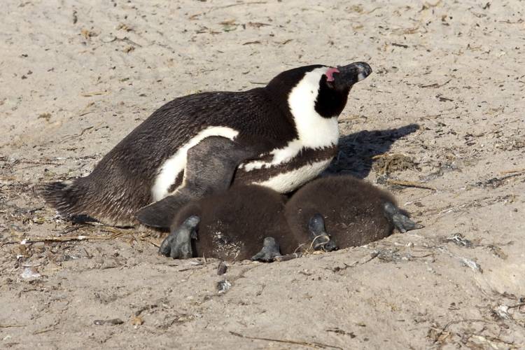 African penguin parents share all the babysitting responsibilities. They spend approximately 40 days taking turns incubating their eggs, while the other parent goes hunting for food or guards the nest from predators.
