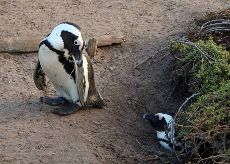 African penguins (and their close relatives) dig burrows that they then decorate with bits of debris. Unfortunately, with the destruction of South Africa's guano islands, there is no longer anywhere for them to burrow as sand tends to collapse. To compensate, African penguins collect more "decorations" (twigs, seaweed and even bits of garbage) to insulate their shallow nests. As these resources are scarce, they have become very adept at sneakily stealing bits of nesting material from each other.