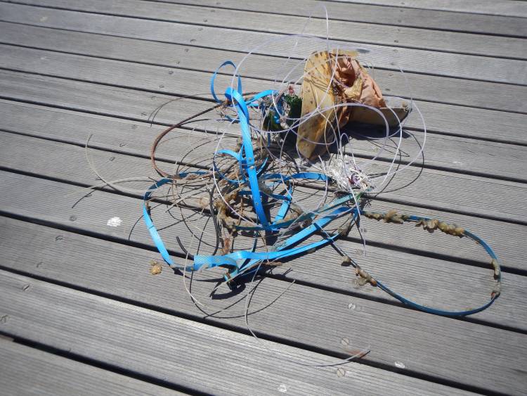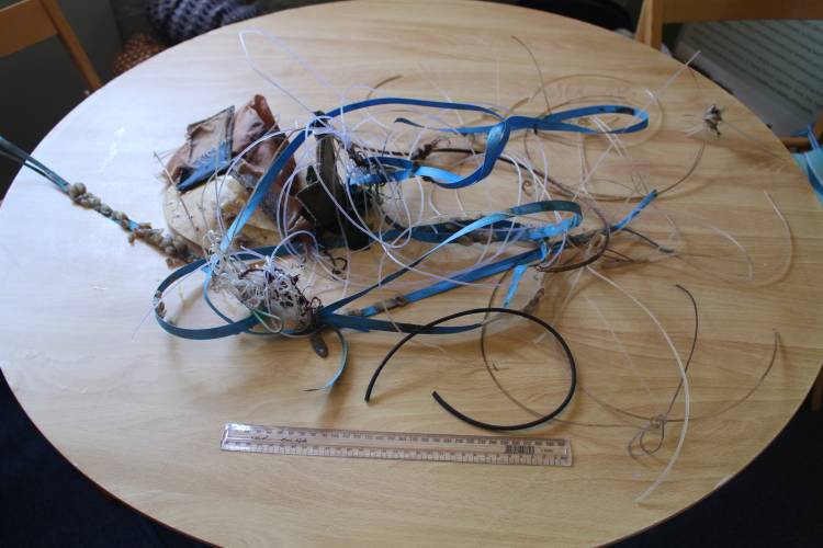 The Aquarium's specialist technician, Vincent Calder, has just arrived back at the Aquarium's offices to show staff a mass of nooses, loops and ties removed from a seal in Table Bay Harbour.
