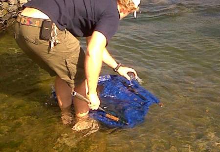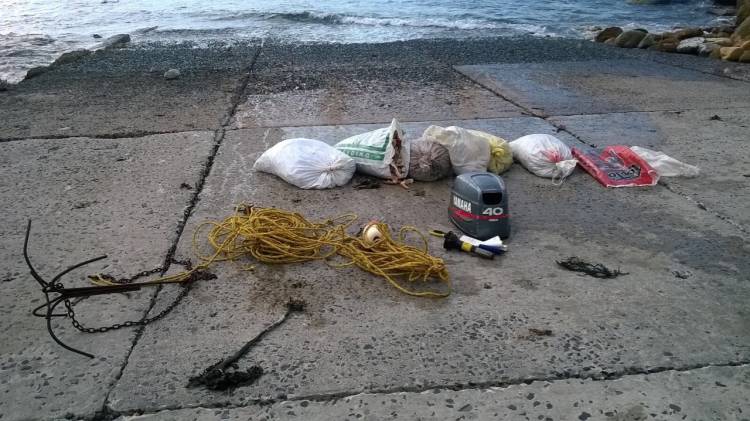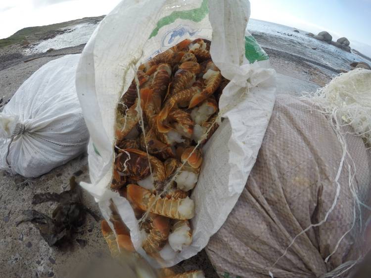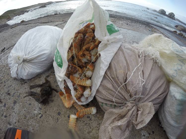“We arrived at 10 o’clock yesterday morning and saw a tied bag lying on the slipway. I said to Paul [van Nimwegen, Aquarium collections team member], ‘I bet you, that’s poached abalone.’ He went to look in the bag and found under-sized little lobster tails. Then we looked into the bay from a height and saw more bags floating around. Eventually we pulled out six bags, full of tails. We did a quick count and estimated that there were at least 5 000 lobsters in those bags.” There were also hundreds of lobster tails scattered on the ocean floor.