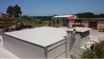 The white building is the oven in which the acrylic panels are “baked” until they are cured.