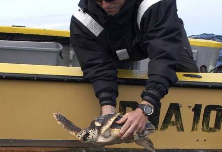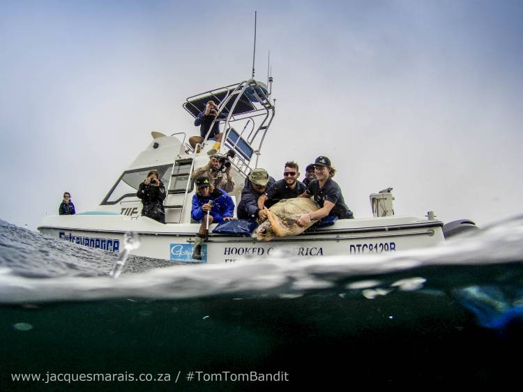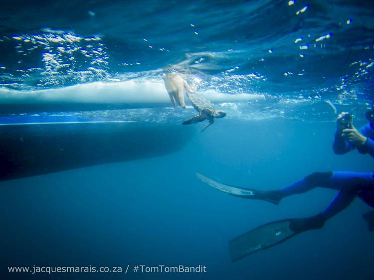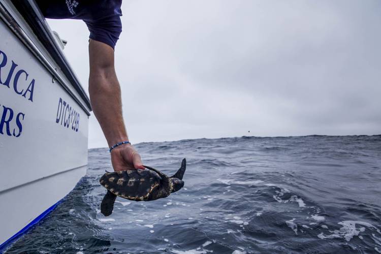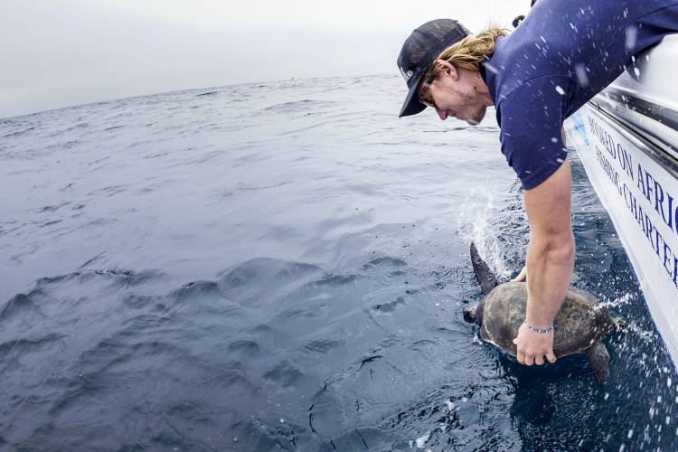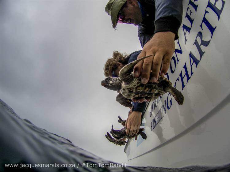 We travelled roughly 30 nautical miles to reach the 300m contour line and 21°C water. Sea turtles aren’t usually found in the Cape’s colder waters down south, but we were able to release them here because, during summer, the warm Agulhas Current pushes closer inshore.