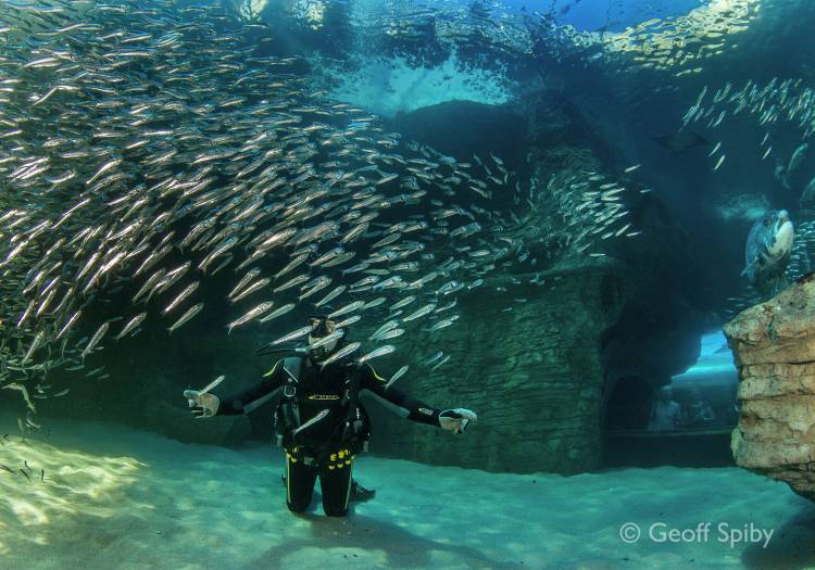 I haven’t dived in years, but I immediately remember how magical it feels. After doing a refresher in the dive pool, Iain Robertson, the dive master, accompanied me into the new 6m-deep tank. Bearded Iain reminds me of a rugged seafarer, a bit of Viking with some Captain Nemo and Pirates of the Caribbean flair thrown into the mix.