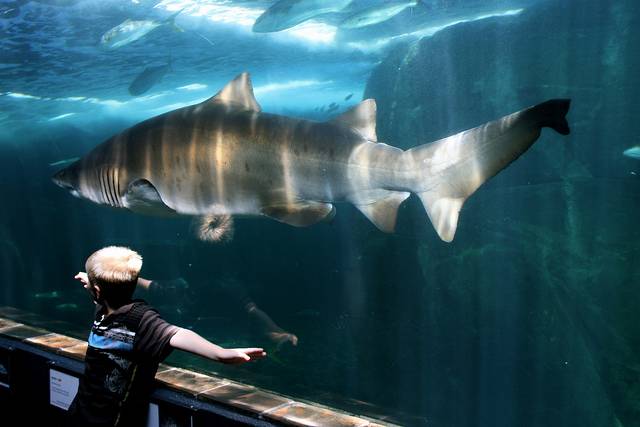 One of our beautiful ragged tooth sharks glides peacefully by while a young visitor looks on. Like the Flickr post suggests, he seems to be saying, “It was thiiiis big…” Most ragged tooth shark specimens grow to be about 3.5 metres in length. Image courtesy Martine Viljoen.