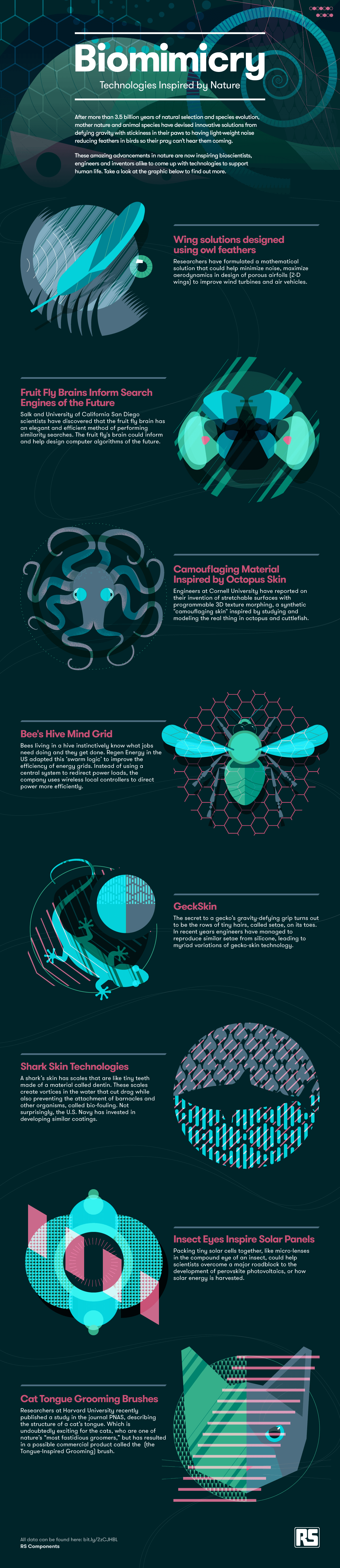 There's a lot we can learn from nature, and RS Components, an electrical component company created this infographic to demonstrate ways that humans strive to keep the pace with new technologies. According to them, biomimicry is something that can help humans keep evolving while being in touch with nature. Let's take a look at some of the most peculiar and exciting technologies that nature is inspiring at the moment: