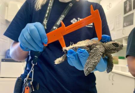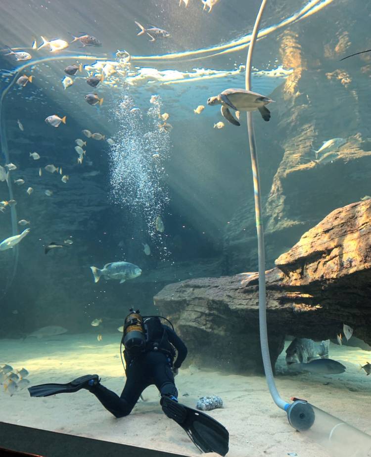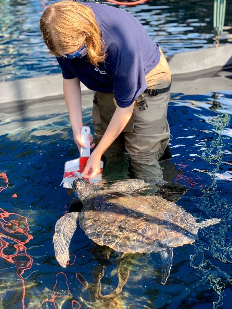 The next step for Harry was to provide him with extra space and depth, with the I&J Ocean Exhibit being the perfect place for this to happen, allowing him to start gaining weight, swimming further and eating more. Harry also met his ultimate roommate, Bob, who is also a long-term turtle rehab patient in our care.