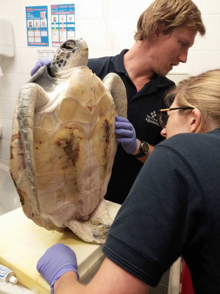 - Initial treatment: Conducted full examination (X-rays and bloodwork), wounds cleaned and bandaged, received freshwater baths to rehydrate, antibiotics and pain relief