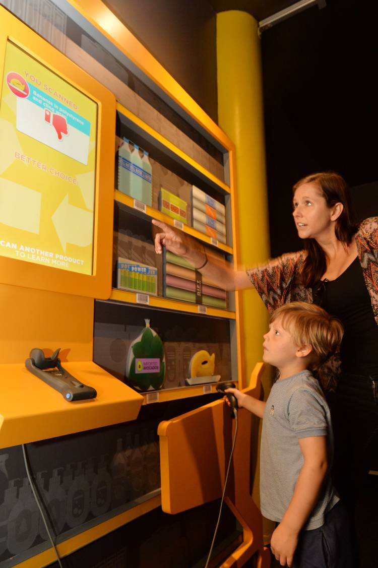 The waste installation encourages visitors to become aware of how their shopping choices contribute to the production of waste, which ends up at landfill sites. Visitors scan barcodes to learn about smarter choices that are better for the environment and ultimately for humans as well.