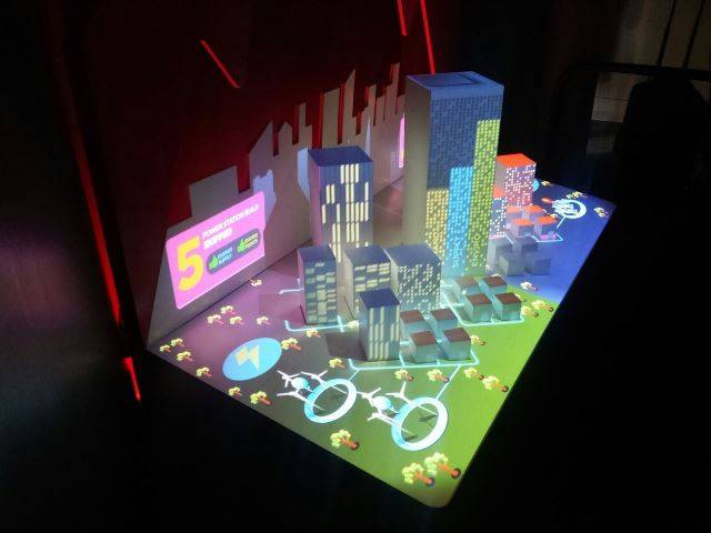 The energy exhibit is a 3D cityscape onto which various scenarios are projected. Through an interactive challenge, visitors learn about the different types of power generation and are challenged to make choices around energy-efficient city planning.