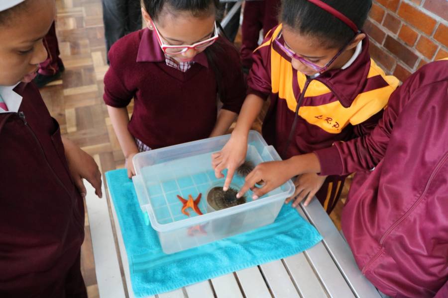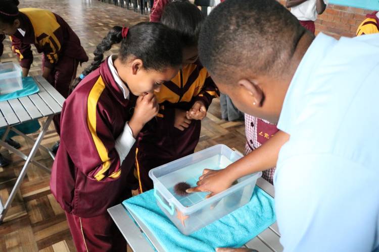 Up next is the Cape sea urchin. At first, its spines are intimidating, but the children soon realise that there is more to these animals upon closer inspection.