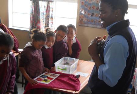 Oceans in Motion lessons are presented by Two Oceans Aquarium Outreach Teacher Thabo Sabeko, who not only designs and delivers these unique classes, but is also responsible for the health and care of his animal assistants. Supporting Thabo are Administration Assistant Nicholas Stevens, who handles the indentification and scheduling of school visits, and Deputy Head of Education Xavier Zylstra, who assists Thabo on multi-day rural outreach projects.