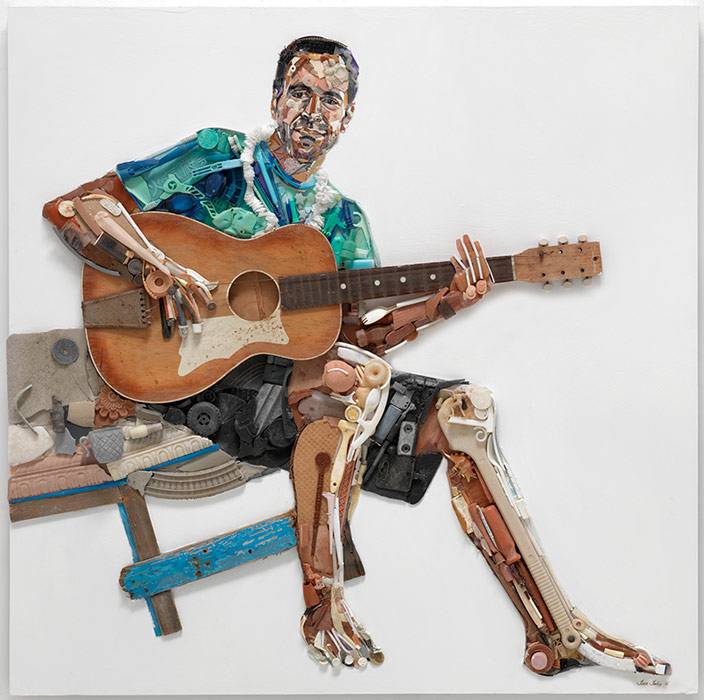 Tess Felix, from the USA, creates portraits out of plastic debris that show a human soul. Her Ocean Eco Heroes series pays homage to people who are champions of the environment. "Even though they are encased in beach trash," says Tess, "a serious purpose still shines through their eyes."