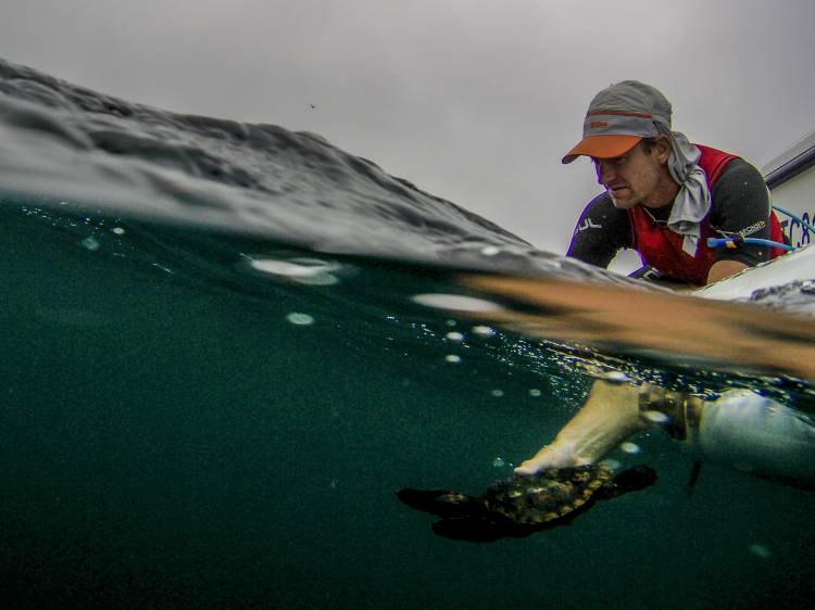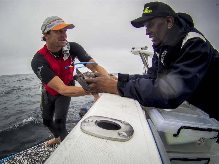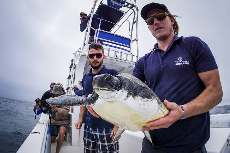 On 1 December 2015, the Two Oceans Aquarium’s turtle rehab-and-release team along with an incredible group of ocean enthusiasts, photographers, filmmakers and ocean ambassadors travelled from Hout Bay, over 30 nautical miles due south, to release 57 turtles, big and small, into the warmer ocean currents off Cape Point.