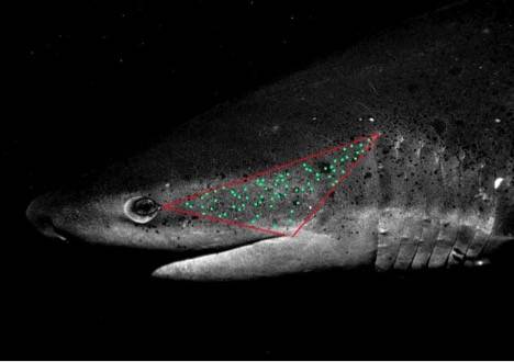 Local divers take a camera with them while diving, and if they encounter a sevengill shark, they take a photograph of the lateral side of the head, without endangering either the animal or the diver’s safety, as the shark passes by.