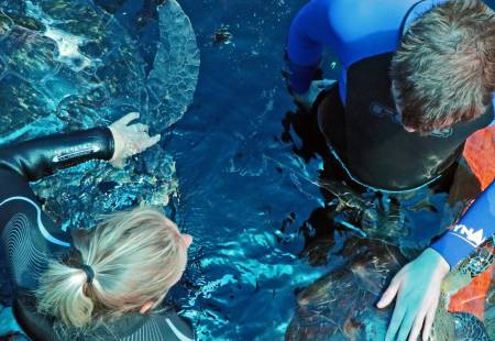 Ragged-tooth sharks have a lesson to share about being misunderstood. Scarred, but gorgeous. Fierce, but gentle. Get close to the sharks of the Predator Exhibit, join them for feeding time, and be daring enough to scuba dive with them.