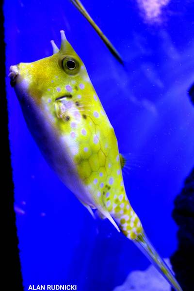 The bright yellow longhorn cowfish is one of the Aquarium’s most photogenic fish. Its body is enclosed in an “armour” of fused bony scales and it has two prominent horns protruding above the eyes, hence the name.