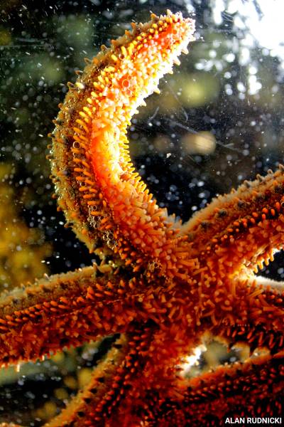 Spiny starfish are common on the rocky shores of the Western Cape. They are either orange or blue-grey in colour. The spines are surrounded by a circle of tiny white nippers that are used for defence and to keep the sea star clean. Each of the starfish's five arm also has hundreds of tiny tubefeet, which enable the starfish to creep slowly over a reef.