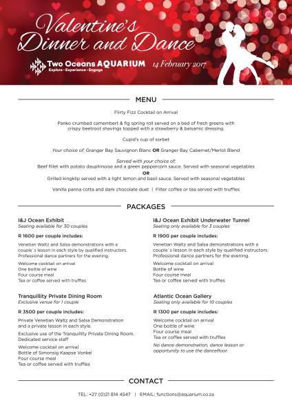 Book your romantic aquatic celebration and enjoy a four-course dinner either in front of the magnificent I&J Ocean Exhibit, in our 10-m long tunnel, in the Atlantic Ocean Gallery, or (as private as it gets) in Tranquility, which has a giant window facing onto the mesmerising Ocean Basket Kelp Forest Exhibit.