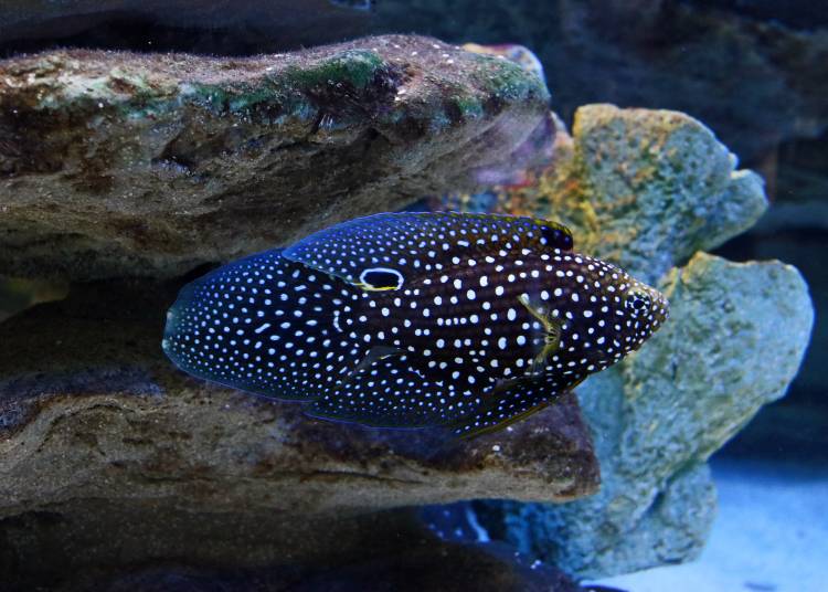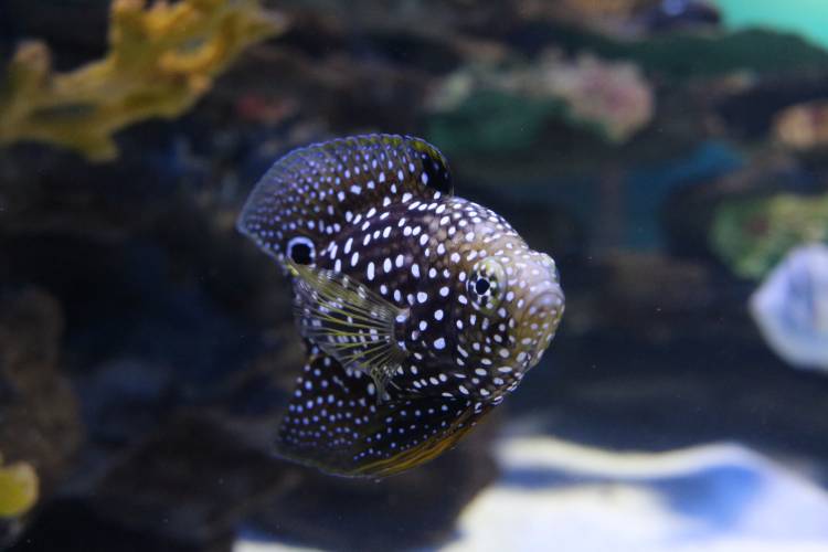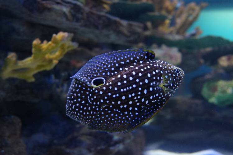 The comet (Calloplesiops altivelis), also known as a marine betta, is a tropical reef fish living along the East African coast that can be seen in our Indian Ocean Gallery. The small white spots on its dark black-brown body serve as amazing camouflage in the shadows of our tropical reef display, but once you've noticed it, its beauty becomes unavoidable.