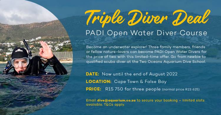 From now until the end of August 2022 you can book a PADI Open Water Diver Course for three people for the price of two! This exciting course gives you a lifelong recreational diving rating that is recognised almost anywhere in the world, and takes you beyond the Two Oceans Aquarium, to learn practical diving skills and abilities out in the beautiful waters of False Bay! Diving is always more entertaining (and safer) with buddies to dive with, and this limited-time promotion is the ideal opportunity for you and your friends and family members to learn together!