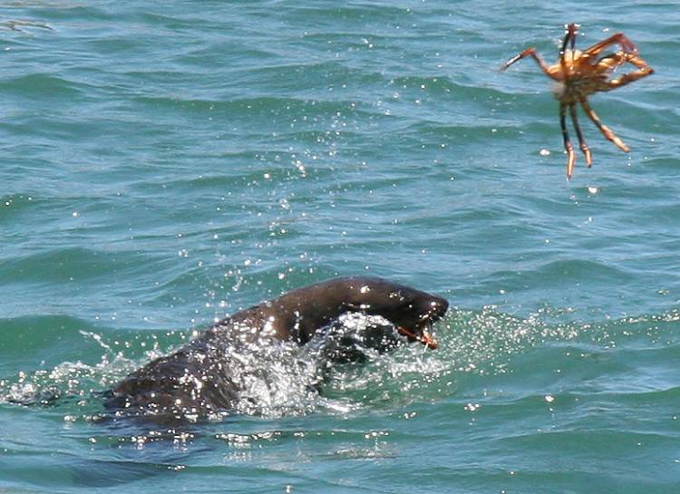 A Cape fur seal plays with its food – West Coast rock lobster for one!