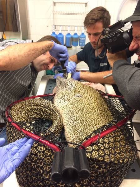 On Thursday 11 May 2017, Two Oceans Aquarium curatorial staff members Tersia Greenstone, Simon Leigh, Nicholas Nicolle and Bamanye Mpetsheni gently removed our large honeycomb moray eel (Gymnothorax favagineus) from the exhibit in the Indian Ocean Gallery. Lady, as she is affectionately called, has been eating less than what is optimal for her, and so it was decided that a thorough health check was in order.