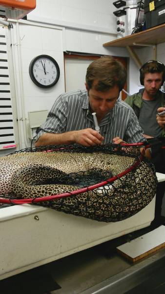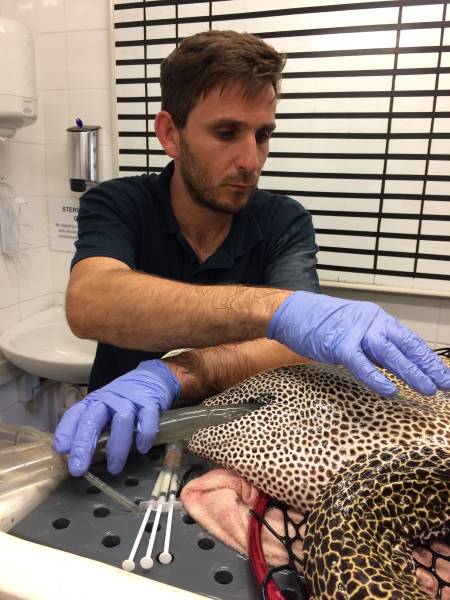 Lady was brought into our animal clinic in a net and placed on the examination table in a large container while water was continuously pumped over her gills throughout the examination. This was made possible via a FARS (Fish Anaesthetic Re-breathing System) that Nicholas designed and built for his MSc studies. Nic also made sure her body was kept wet by syringing water over her regularly.
