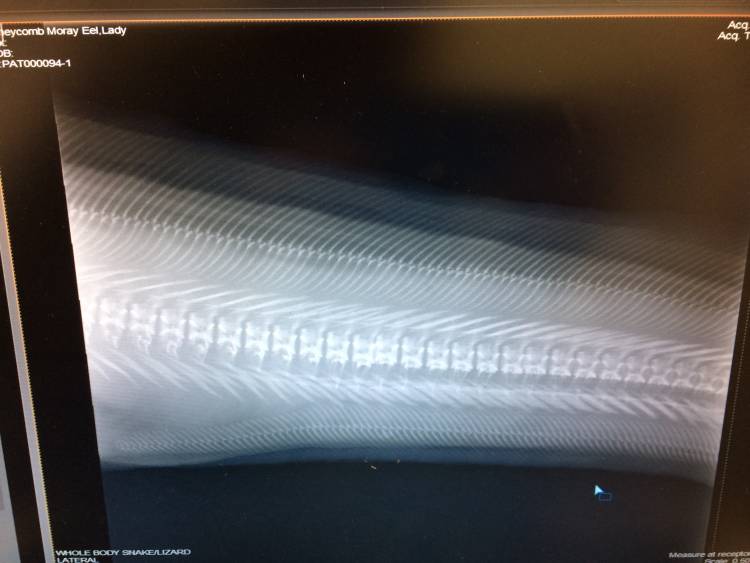 Further X-rays were taken of Lady’s abdominal area and spine. Blood was also drawn – this can be quite a challenge in eels as it is not easy to pierce the tough skin with a needle. The blood was sent to a pathology laboratory for testing.