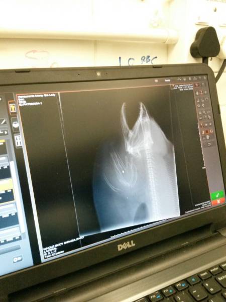 The first X-ray was taken of her head area to check whether there were any signs of abnormalities or growths around her esophagus. Eels have a second jaw called a pharyngeal jaw that enables them to catch and hold onto their prey, dragging it into the back of their throats. This was the inspiration for the monsters in the Alien series!