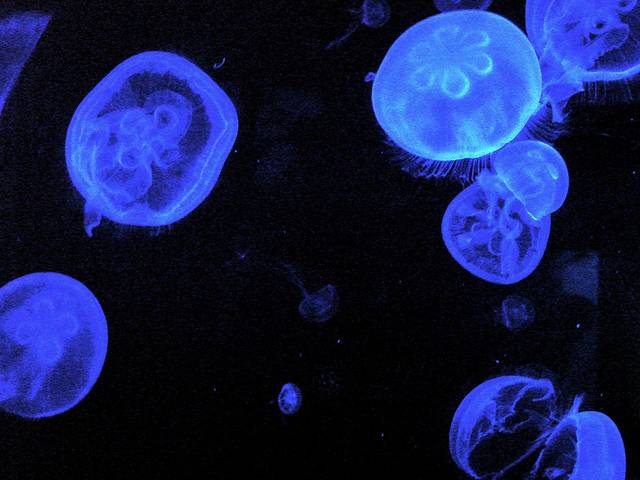 Our ghost-like moon jellyfish light up with an electric blue light in this beautiful shot. Their stings lack the toxic punch found in most other jellyfish. Photo courtesy Martine Viljoen.
