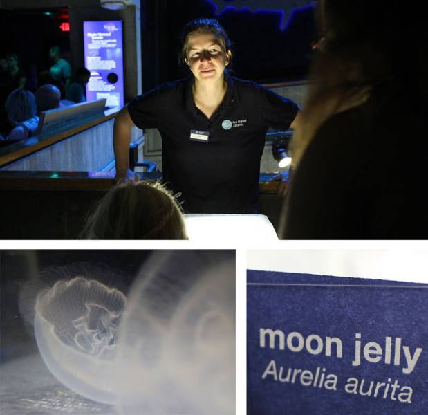I was able to participate in a few visitor interpretations. These included the aquarium’s climate change experiences. They use an interactive game to get children to think about the sources of carbon, both natural and human-made. This generated good discussions about what the source of the problem is and what we can do to change the amount of carbon dioxide being produced. Their octopus camouflage game is a great way of introducing the concept of camouflage and how it helps animals to survive. There were live jellies in a small container and a sample of trawl with plastics in it. Live animals or dried specimens draw visitors to a table, which results in a more meaningful interaction about jelly biology and impacts of plastic in the environment.