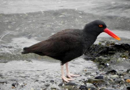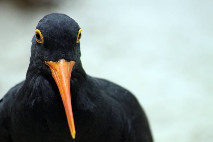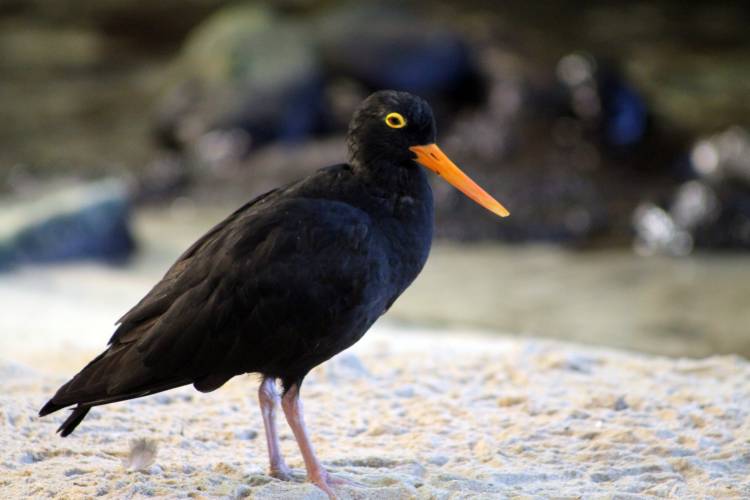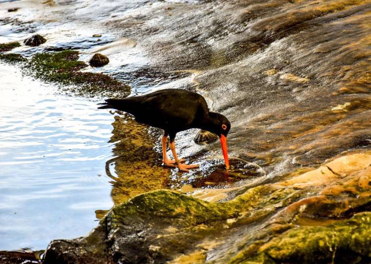 African black oystercatchers (Haematopus moquini) are seabirds found along the coast and offshore islands of South Africa and Namibia. Despite having the name "oystercatcher", they do not eat oysters, instead using their powerful, bright orange beaks to pry a variety of other invertebrates from the rocks - mussels and limpets - and sometimes they even eat fish.
