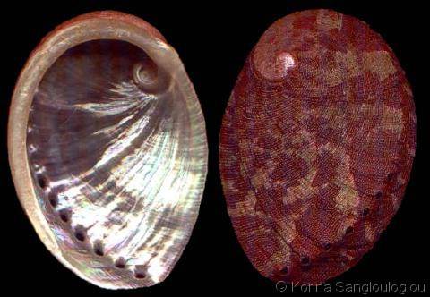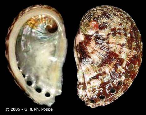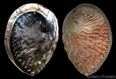 This abalone is ear-shaped, with a shell commonly stained with red blotches. It is a small abalone, rarely growing larger than 8cm.