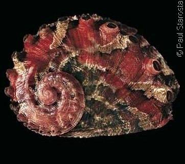 The smallest abalone species, rarely growing beyond 45mm, the siffie is notable for the large hump that traces the spiral of its shell. Its shell is a mottled orange-brown, and its head has bright orange tentacles.