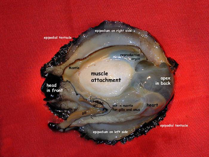 Its soft body is surrounded by a shell-secreting mantle, a head and a very large muscular foot. The outer edge of the foot is called an epipodium, a sensory organ that is covered by a host of tentacles. The arrangement of tentacles, colours and patterns on this epipodium is unique to each species of abalone.