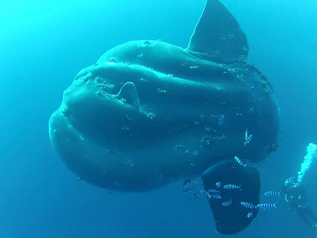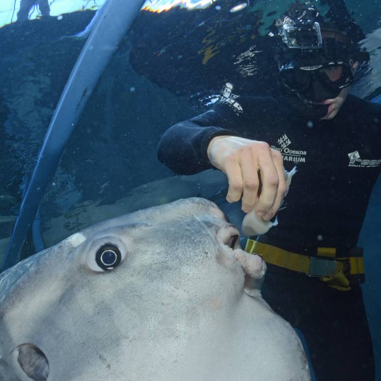 Ocean sunfish are naturally curious and friendly, likely due to their reliance on other species that rid them of parasites. In an aquarium they have little trouble interacting with other exhibit inhabitants or divers – in fact, the ocean sunfish brought to the Two Oceans Aquarium at the end of 2017 was readily eating from the hands of scuba divers within a day.