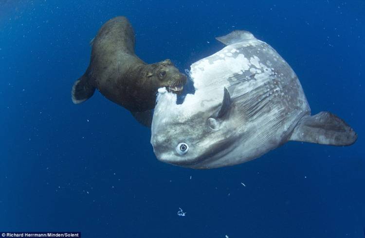 Sunfish are predated on by orcas, great white sharks and seals. Sea lions seem like the most vicious predator - often they will simply eat the fins off of the sunfish and leave it to die slowly (warning: link is upsetting). When young, sunfish are preyed on by bluefin tuna (Thunnus thynnus) and dorado (Coryphaena hippurus).