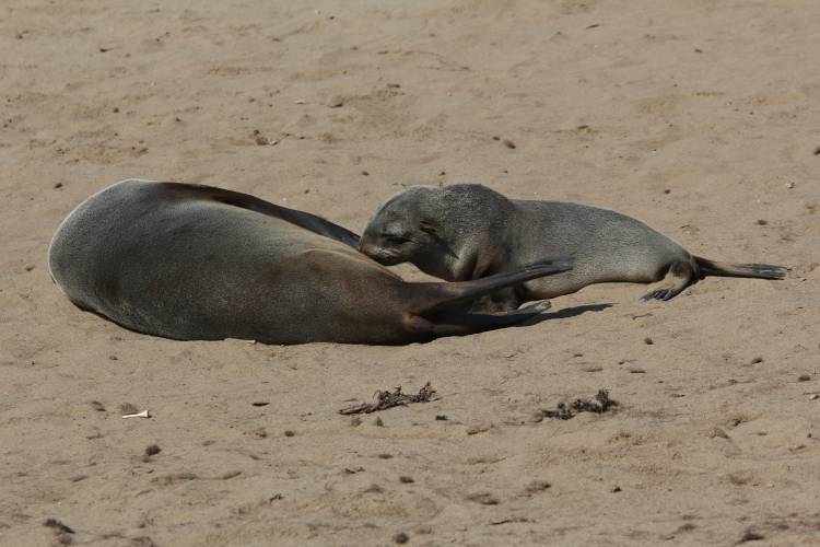 Cape fur seals begin life on land, under the care of their mothers and are born between late November and early December. Unlike the brown fur of the adults, they are born black and will become grey as they moult within the first few months of their lives. For about six months, they will feed off their mother's milk - the mothers alternate between spending up to a week at sea and a few days on land to care for their pups. Because pups are not born with any insulating fat, they cannot enter the water and are entirely dependent on their mothers for care - although they have been observed forming groups and playing while waiting for the females to return!