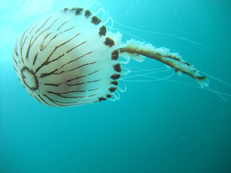 The Benguela compass jelly (Chrysaora sp.), sometimes knows as the “sea nettle”, is found only in the coastal waters of South Africa. It is a large jelly, growing up to 2m long and 80cm wide. Fortunately for us humans it doesn't rely on its tentacles to catch large prey, so it has a relatively mild sting. Instead, it has four long oral arms with which it catches and feeds on other jellies.